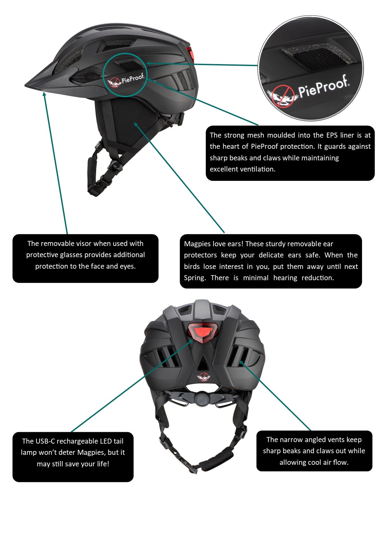 PieProof Helmets change to suit the season within seconds. When the Magpies lose interest in you, put away the accessories until next Spring to enjoy lightweight, cool and comfortable protection. (1:28 mins)